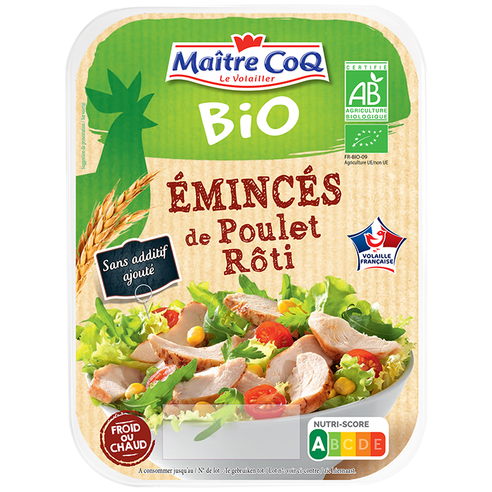 Les Emincés de poulet rôti Bio sont élaborés à partir de haut de cuisse de poulet fermier bio, d'origine France, élevé en plein air et nourri sans OGM (<0,9%)*.